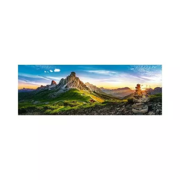 Puzzle-ul Trefl: Dolomiții înfățișă Trecerea Giau din Italia. Produsul de înaltă calitate, de rezoluție HDR, elementele se potrivesc perfect, astfel imaginea rezolvată poate fi decorul superb a camerei. Dimensiunile imaginii rezolvate: 97 x 37 cm